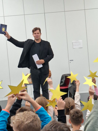 Lesen macht reich! Diesen Satz von Kinderhand auf einen fünfzackigen Stern notiert, unterschrieb der Soziologe und Kinderbuchautor Armin Pongs am Donnerstagmorgen in der Johann- Peter-Hebel-Grundschule nur zu gerne. Mitgebracht hatte er für die dritten und vierten Klassen sein Buch „Der magische Kalender“.